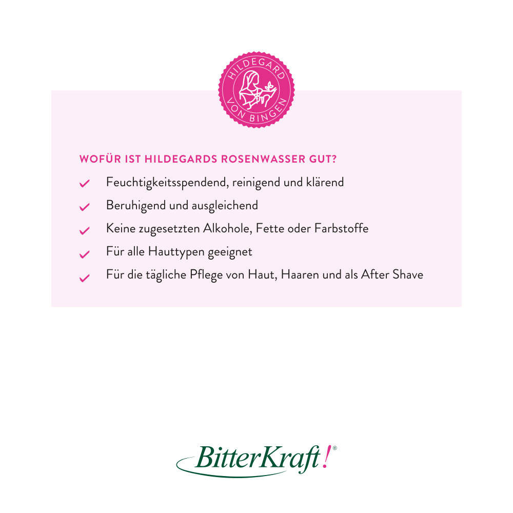 Das Rosenwasser von BitterKraft! ist ein vielseitiges Tonikum. Es erfrischt die Haut, beruhigt und pflegt. Ein Muss in jeder Hautpflegeroutine.
