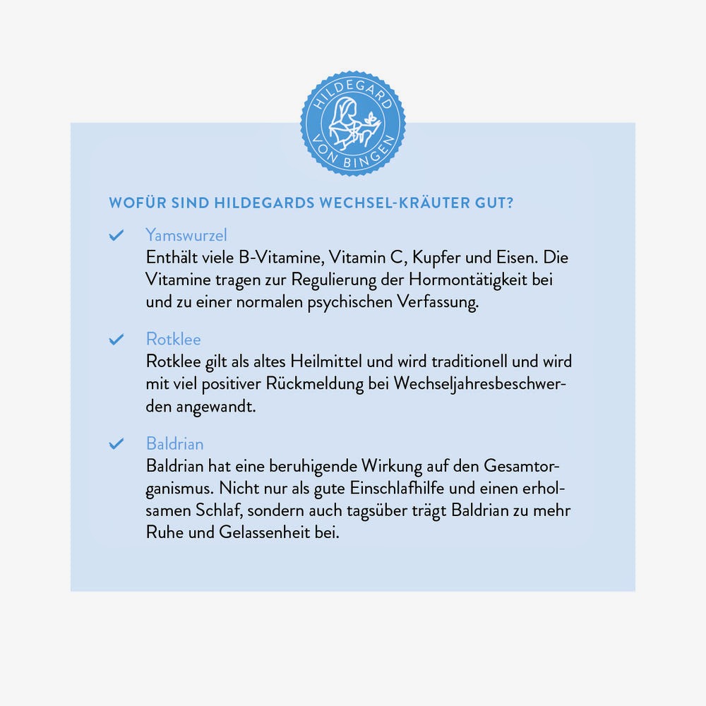 Wilder Yams Extrakt, Rotklee Extrakt Pulver, L-Ascorbinsäure, Baldrian Pulver, Eisen Bisglycinate, Vitamin B6 – Pyridoxine, Vitamin B12 Methylcobalamine, Calcium L-Methylfolat MTHF, Vitamin B9 (Folsäure)