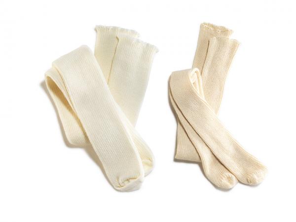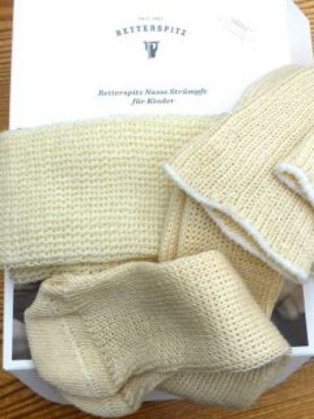 Wadenwickel sind ein altbewährtes Hausmittel und dank der nassen Strümpfe für Kinder von Retterspitz jetzt im Handumdrehen angelegt. Das Set besteht aus insgesamt 4 Kinderstrümpfen, die bis über das Knie reichen: 1 Paar Außenstrümpfe aus Wolle mit 50 % Schurwolle und 1 Paar Innenstrümpfe aus 100 % Baumwolle.