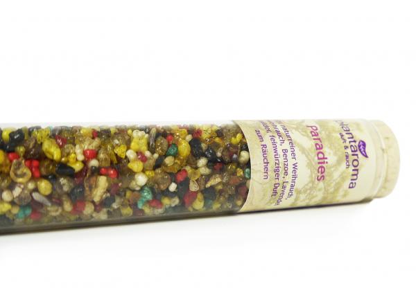 Ein Weihrauch Klassiker! Die Mischung Paradies besteht aus 100% naturreinem Eritrea-Weihrauch, verfeinert mit Räucherwerk & Blüten.