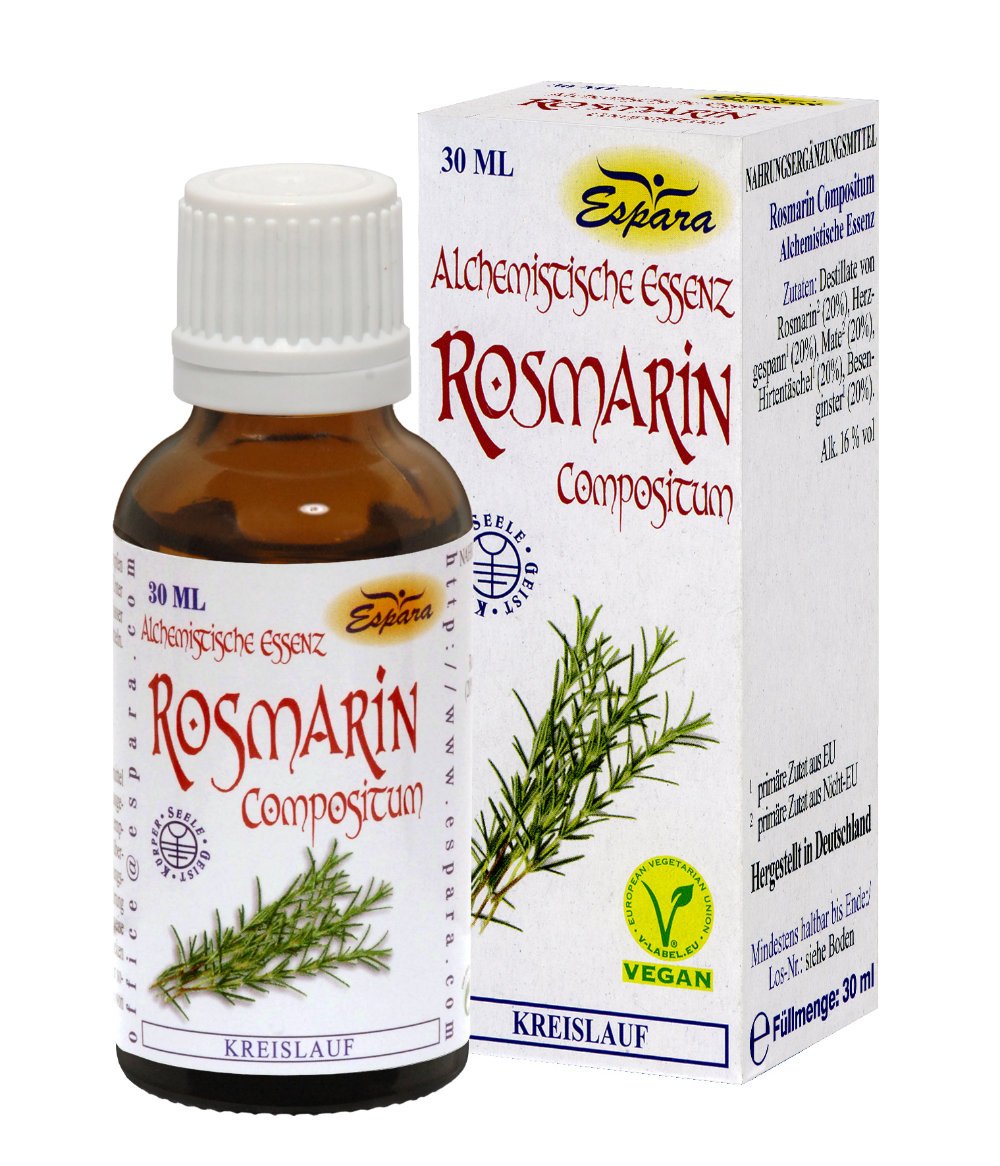 Nahrungsergänzungsmittel mit Destillaten von Rosmarin, Herzgespann, Mate, Hirtentäschel und Besenginster, Alk. 16% vol.