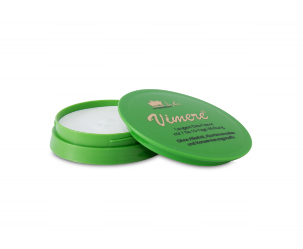 Die Vimere® Deo Creme pflegt Ihre Haut mit wertvollen Natursubstanzen und schützt Sie bis zu 10 Tage lang vor unangenehmem Körpergeruch. Eigentlich ist Schweiß geruchslos, doch wenn Bakterien die Bestandteile des Schweißes zersetzen, entsteht ein Geruch, den wir als unschön und störend empfinden. Deswegen benutzen viele Menschen Deodorants, die Aluminiumsalze enthalten – diese Deos bezeichnet man als Antitranspirante, weil die Salze die Poren blockieren und das Schwitzen so verhindert wird. Doch das muss nicht sein! Setzen Sie mit der Vimere® Deo Creme auf ein Produkt, das die natürlichen Körperfunktionen nicht beeinträchtigt und trotzdem unangenehmen Schweißgeruch verhindert.